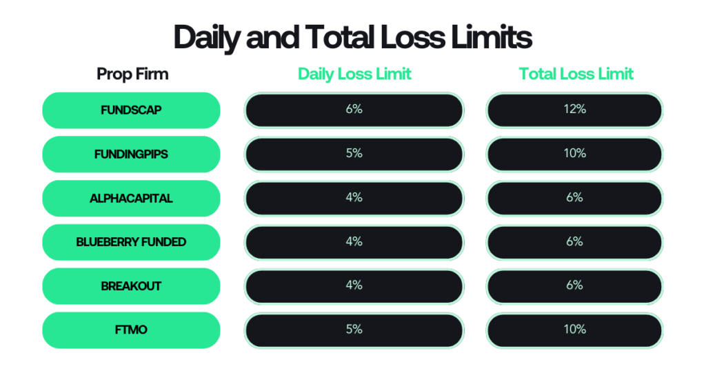 As part of internal risk control, setting loss limits needs to be precise and well-defined. Evaluations require clear guidelines, though these guidelines may change. It’s important to note that these rules are not mandatory, so not all prop firms have a daily loss limit, for example.