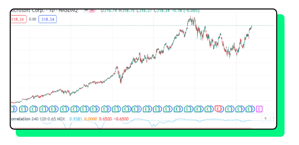 También https://www.mataf.net/es/forex/tools/correlation , que nos permite realizar diferentes tipos de filtros y relaciones de diferentes pares de forex. Para otro tipo de mercados, existen diferentes indicadores en las plataformas de Trading en análisis técnico, por ejemplo, https://www.tradingview.com/script/uy1LMmRg-Correlation-Matrix-Heatmap-By-Leviathan/ , en el pueden graficar una matriz con los activos deseados, recomiendo evaluar diferentes combinaciones para encontrar correlaciones muy interesantes que generan valor y oportunidades de estrategias a través de correlaciones fuertes. También existe otro indicador, el cuál te permite graficar la correlación de dos activos a lo largo del tiempo, y el trader decide cuáles activos debe graficar. Por ejemplo, una gráfica de Microsoft y en el indicador evaluó su correlación con el NASDAQ.