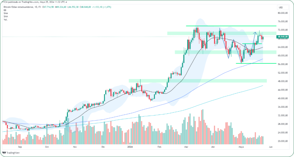 Al 23 de mayo de 2024, Bitcoin cotiza a alrededor de $69.700 después de un impulsión alcista apoyada en medias móviles y una estructura de giro hombro cabeza hombro que llevó el precio de un impulsó inmediato bajista a ubicarse por encima de SMA 200, SMA 100 y SMA 20. Actualmente se encuentra retando la resistencia previa a su máximo histórico.