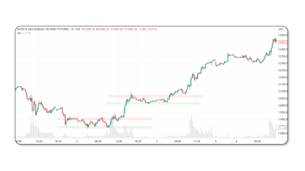 O simplemente, analizar en qué zona nos encontramos a una temporalidad mayor. Ya que, el ciclo del mercado se repite múltiples veces en temporalidades menores. Es decir, si estamos en una tendencia alcista con velas de un día, el mercado en ese día, tuvo tendencias alcistas, distribuciones, acumulaciones y tendencias bajistas. Por lo tanto, al identificar zonas de oferta y demanda en temporalidades mayores a través de análisis técnico o del mismo volumen. La probabilidad de que el mercado haga una reversión en largo es mucho más probable si nos ubicamos en una zona de demanda de mayor tiempo.