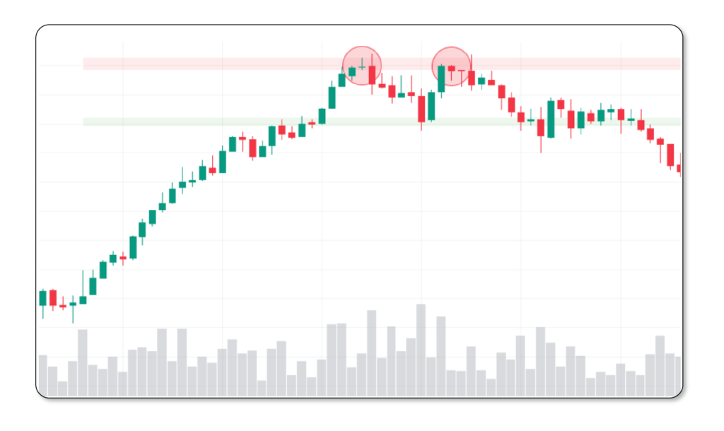 Doble techo y doble suelo: Este patrón se forma cuando el precio alcanza dos veces un nivel máximo (doble techo) o un nivel mínimo (doble suelo). Estos patrones vienen acompañados por un volumen alto en su primer contacto con el primer techo o el primer suelo, y un volumen menor en el segundo contacto con el techo o suelo. El análisis que se realiza es, si con el volumen anterior no se logró romper esa zona, ¿Es posible que un volumen menor pueda romper la zona de demanda (para doble suelo) o de oferta (para doble techo)?, en la mayoría de los casos la probabilidad de que logre romper la zona con un volumen menor al anterior es muy baja.