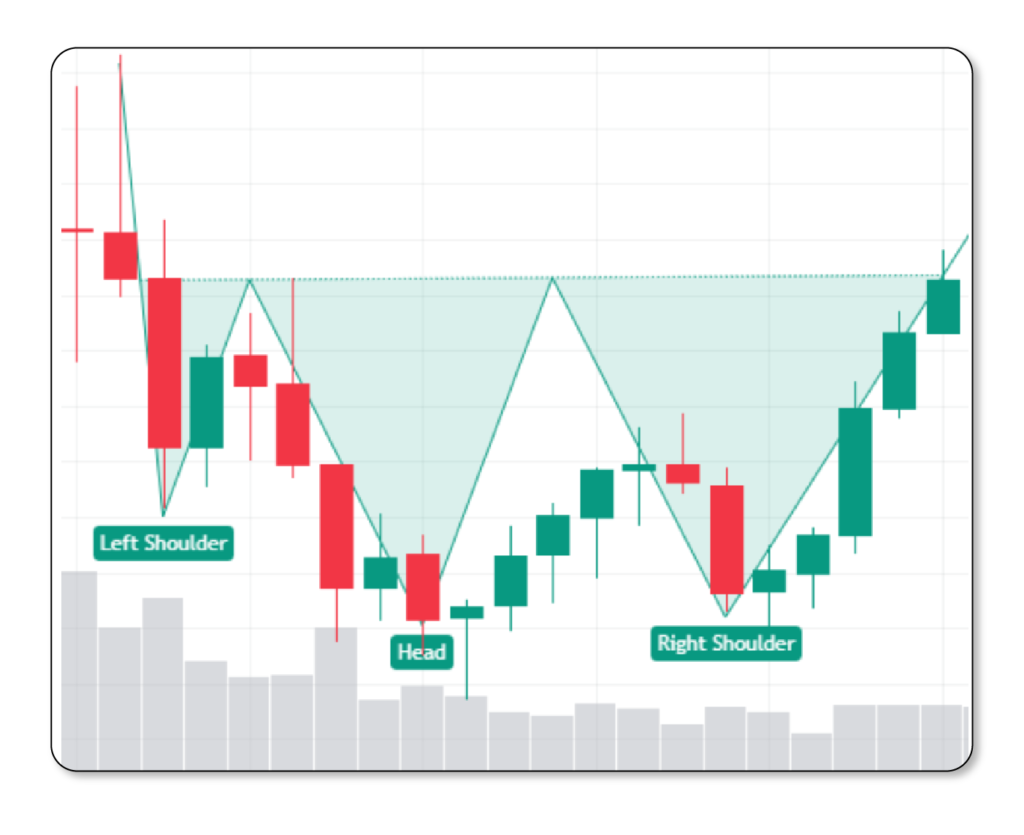 En este caso, el hombro izquierdo, tiene un volumen elevado, en la cabeza, la cual es una bajada con mayor profundidad que la del hombro izquierdo. Podemos concluir, que no es muy probable que ese precio continúe haciendo mínimos más bajos, si el volumen en esa bajada fue mucho menor al anterior, si un volumen mayor no pudo romper esa zona, es poco probable que este lo haga. Vemos su reingreso, posteriormente el hombro derecho, con incluso menor volumen que los otros dos, confirmando el patrón de giro.