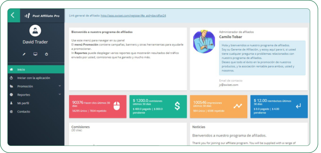 Como afiliado, dispondrás de un enlace personal para referidos, permitiéndote supervisar el progreso y el estado de cada uno. Además, podrás visualizar tus ganancias, la disponibilidad de retiros y obtener métricas valiosas a través de Post Affiliate Pro (https://www.postaffiliatepro.com/), herramientas que te apoyarán en fortalecer tu estrategia de referidos.