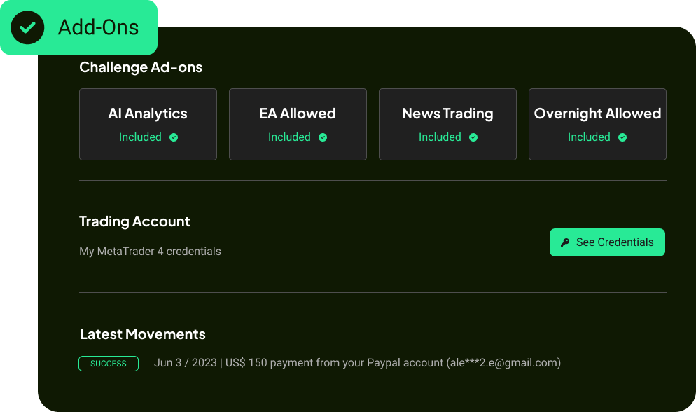 Give your traders an intuitive experience with real-time analytics, challenge tracking, and AI-powered insights — all in one dashboard.