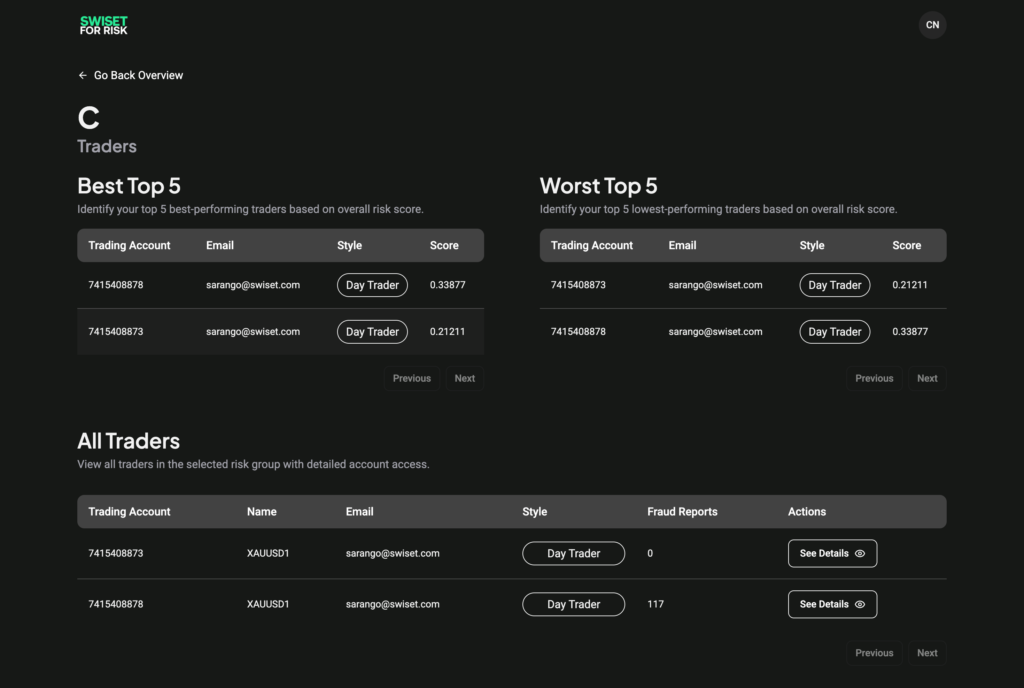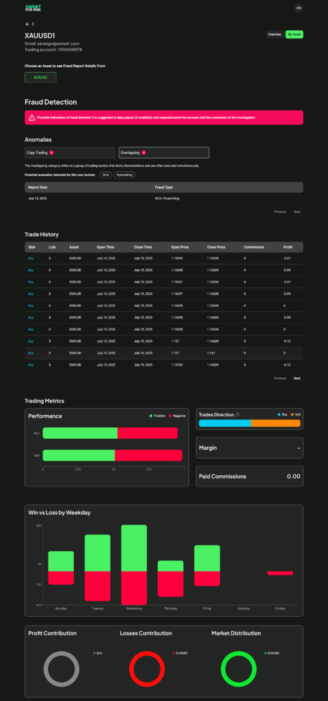 Swiset is purpose-built for prop trading and brokerage ecosystems — merging CRM, risk analytics, and fraud detection into one intelligent layer.